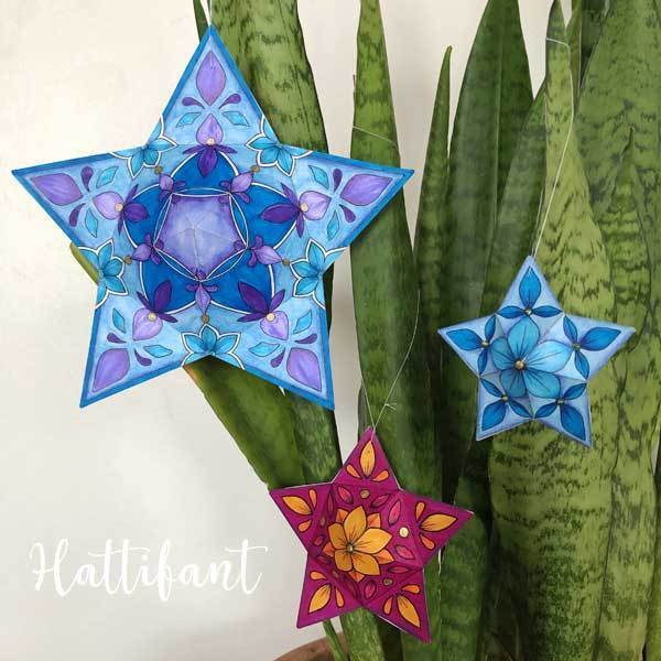 For personal use only. Commercial use prohibited. All art work is copyright of Manja Burton (Hattifant). Copyright is non-transferable. You are not allowed to upload the printable to your server and website to share with others. Please LINK to https://hattifant.com/christmas-3d-star-ornaments-to-color/ for people to find the paper craft bundle!