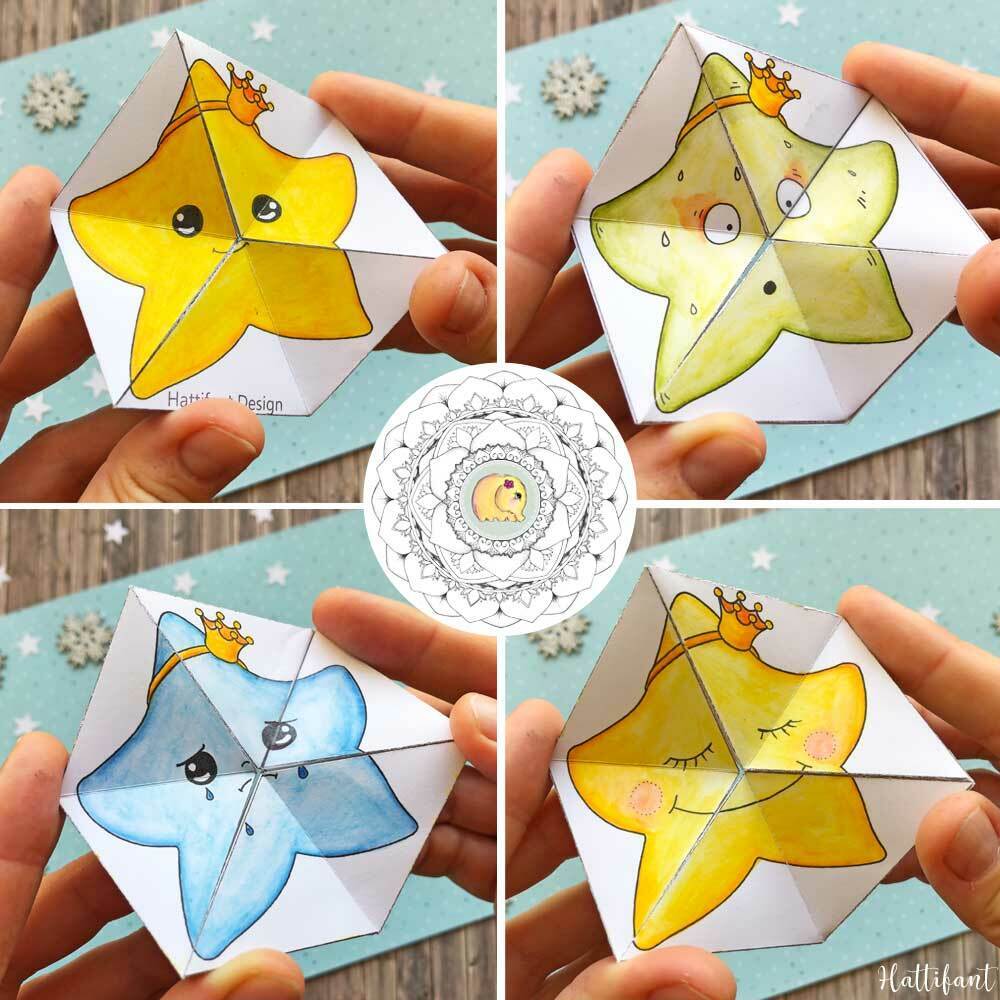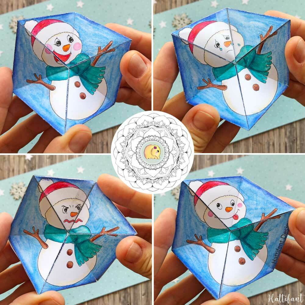 For personal use only. Commercial use prohibited. All art work is copyright of Manja Burton (Hattifant). Copyright is non-transferable. You are not allowed to upload the printable to your server and website to share with others. Please LINK to https://hattifant.com/papercraft-kaleidocycle-emotional-winter-christmas/ for people to find the paper craft bundle!