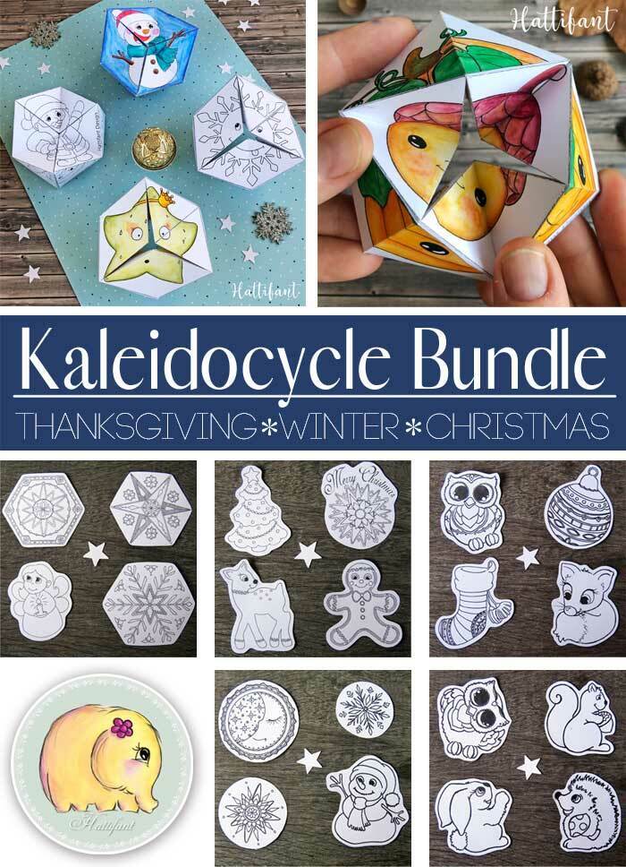 Here is a TIME SAVING bundle of 10 different Thanksgiving, Christmas and Winter themed Paper Toys called Kaleidocycle or Flextangle to Color, Craft and Play with.