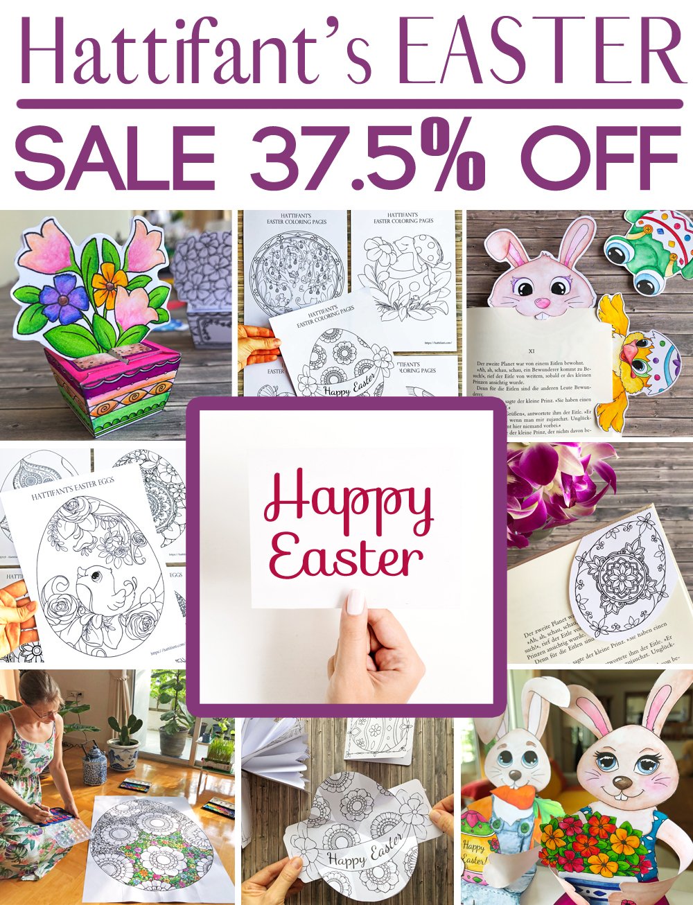 Commercial use STRICTLY PROHIBITED. All art work is copyright of Manja Burton (Hattifant). Copyright is non-transferable. DO NOT upload Hattifant printable on to your website or share the blank coloring pages or crafts elsewhere. If you choose to share your colored creations (PLEASE DO! ;-) ) in any social media then please MENTION Hattifant as the creator and link to https://hattifant.com/easter-2019-paper-craft-bundle/ accordingly. Many thanks!