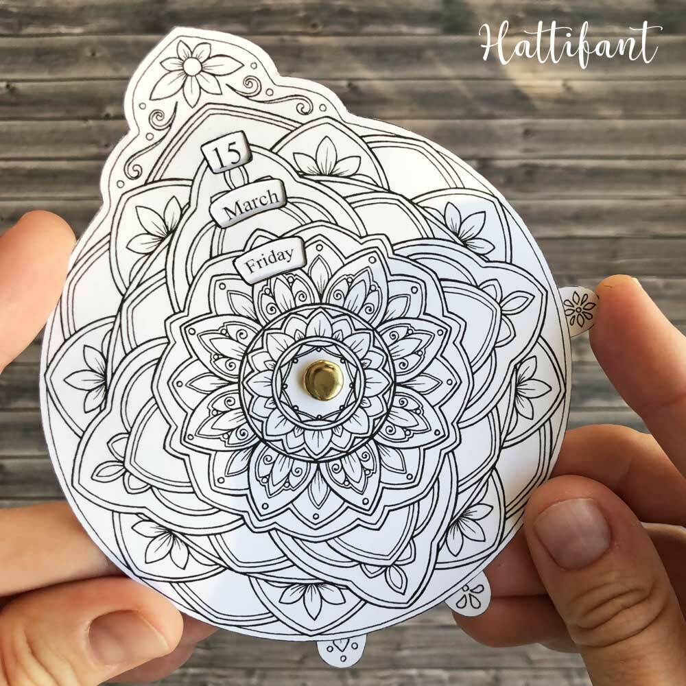 For personal use only. Commercial use prohibited. All art work is copyright of Manja Burton (Hattifant). Copyright is non-transferable. You are not allowed to upload the printable to your server and website to share with others. Please LINK to https://hattifant.com/perpetual-mandala-calendar-to-color/ for people to find the paper craft bundle!