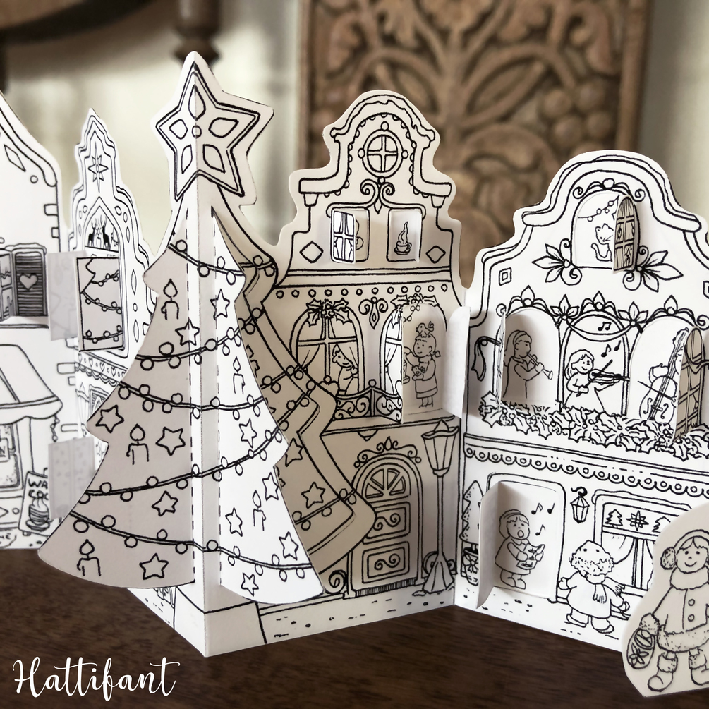 For personal use only. Commercial use prohibited. All art work is copyright of Manja Burton (Hattifant). Copyright is non-transferable. You are not allowed to upload the printable to your server and website to share with others. Please LINK to https://hattifant.com/christmas-town-advent-calendar-to-color/ for people to find the paper craft bundle!